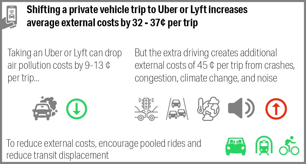 Since rideshare vehicles don’t usually need to do a cold start for a given ride, and are generally newer cars with lower emissions to begin with, it’s estimated that a TNC trip produces about half the pollutants as the same trip done in your personal car. That amounts in their estimate to about 11 cents’ worth of value on average.