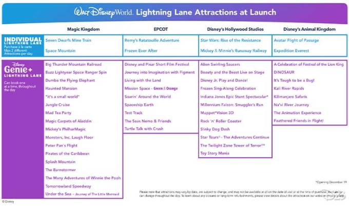 Disney Genie+, meanwhile, opens up Lightning Lanes at a total of 40+ attractions across the four parks instead, including many more of the Tier 1 rides. It will be priced at $15 per ticket per day at Walt Disney World Resort and $20 per ticket per day at Disneyland Resort, when available.