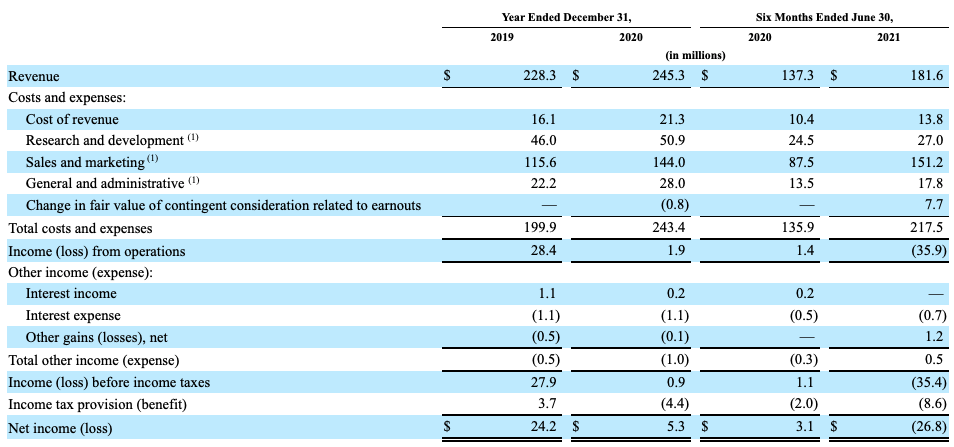 More recently, growth has sped back up, with NerdWallet posting $137.3 million in H1 2020 revenues, a figure that expanded to $181.6 in the first half of 2021. The latter figure represents growth of just over 32%, a much healthier number than what the company recorded in 2020.