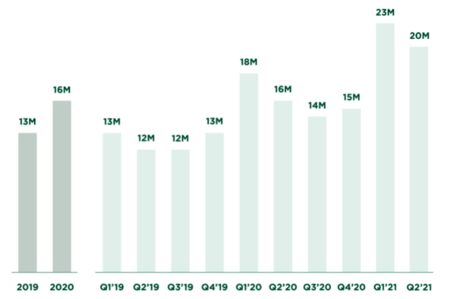 The result of the above is that NerdWallet has posted record traffic numbers. As we observe the following, keep in mind that “approximately 73% of all traffic to NerdWallet came organically through direct or unpaid channels” in the 12 months concluding June 30, 2021: