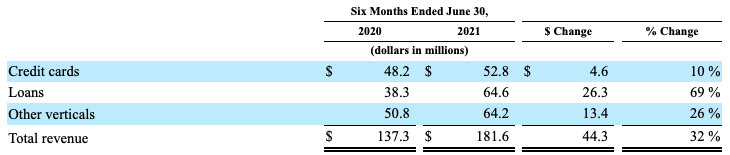 Our credit cards revenue decreased 30% for the year ended December 31, 2020 compared to the same period in 2019, primarily due to lower approval rates in the market due to economic uncertainty resulting from the pandemic and tighter underwriting criteria. Our credit cards revenue increased 10% for the six months ended June 30, 2021 compared to the same period in 2020, primarily driven by increased activity amid recovery from the economic impacts of the COVID-19 pandemic and higher pricing with our financial services partners.
