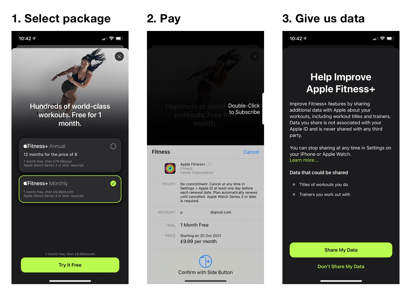 For example, immediately after signing up, Apple asks for access to your data. This kills the sign-up momentum. At a point where the user is expecting a benefit (access to the workouts), they’re doing the reverse — being asked to give something to Apple.