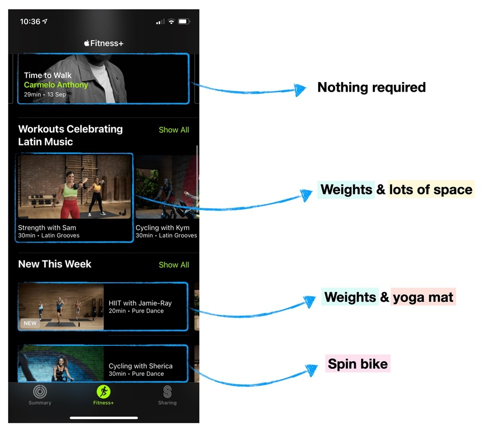 This is essentially what happens with Apple Fitness+ — they show you workouts on the homepage, despite many (if not most) being unsuitable for you, and then don’t provide any obvious means to filter the options.