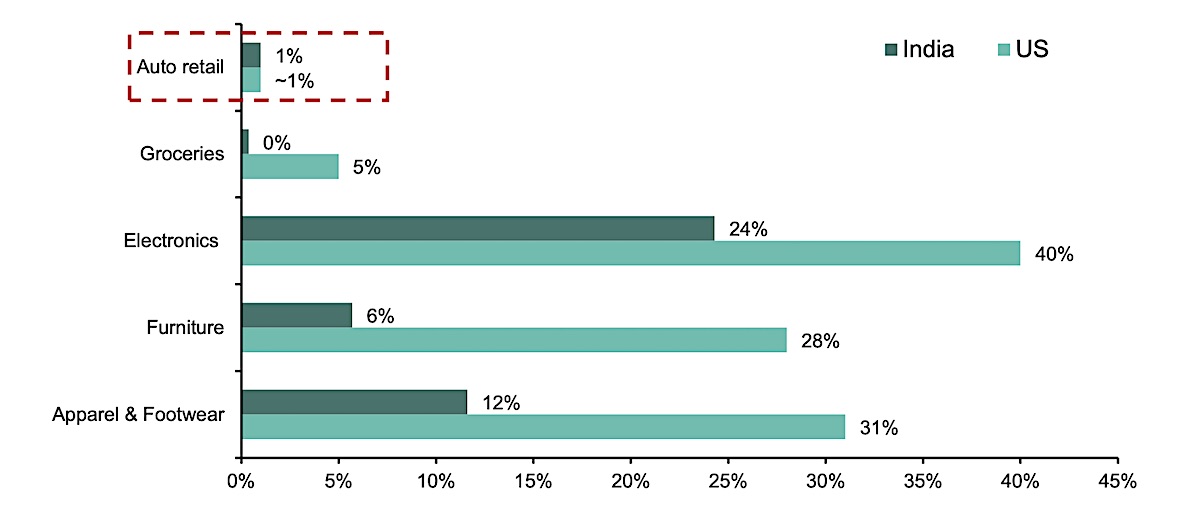 Auto e-commerce generally has low penetration globally, with India and U.S., for example, having a 1% penetration, according to analysts at Bernstein. “This is largely because the auto market still requires physical inspections and the target market skews towards used vehicles — an unorganized market. The total addressable market in India is around $220 billion, which includes used vehicle purchase by consumers, auctions and remarketing, growth potential for the new vehicles market, and financing and advertisements. The total addressable market for only the used car market in US is over $800 billion,” they wrote in a report earlier this year.