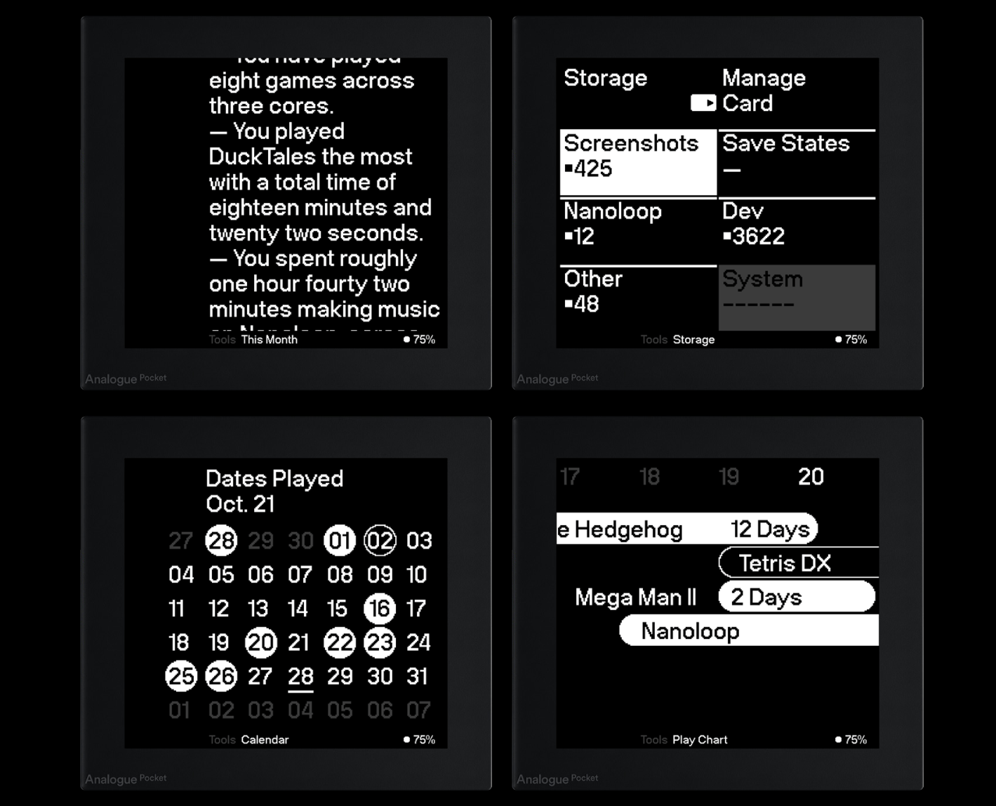 To start with the OS will be a flexible and extensible way to play and track your games. If you’ve got dozens of games for the GameBoy, Game Gear, Lynx and so on, you certainly could just pop one in and play. But the Pocket is meant to be a showcase, not simply the nicest way to play those games (though it almost certainly will be that).
