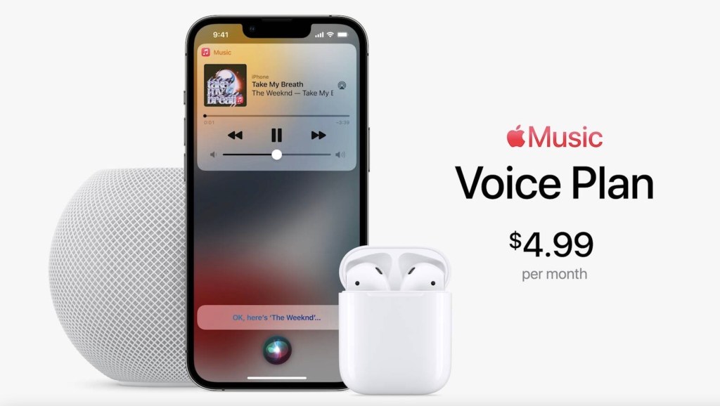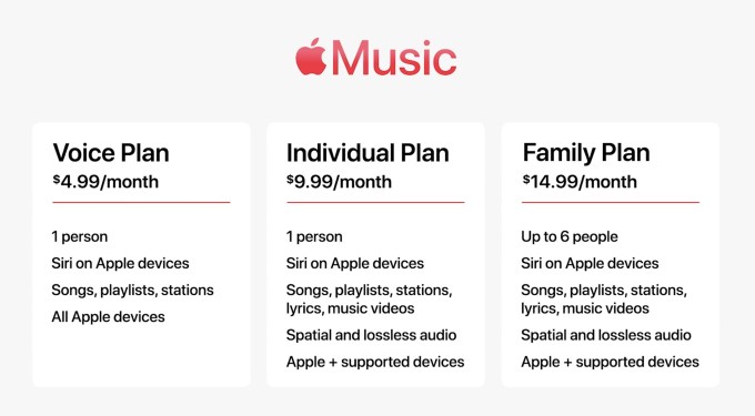 While Apple says the new Voice plan can be used to access Apple Music across “all your Apple devices,” it’s clearly been designed with HomePod in mind — similar to Amazon’s free music streaming for Echo. If using a phone, tablet or computer, it wouldn’t necessarily make sense to speak to Siri to play music when you have a device with a screen. However, the service could possibly be interesting to those who primarily listen to Apple Music via their AirPods — and don’t mind speaking all their commands.