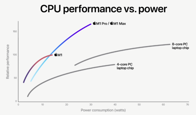 “Now let’s compare the M1 Max to the chip running in the fastest PC laptop we could find,” Apple joked in its event, comparing it to some of its rivals, flexing its power-supping superpowers.