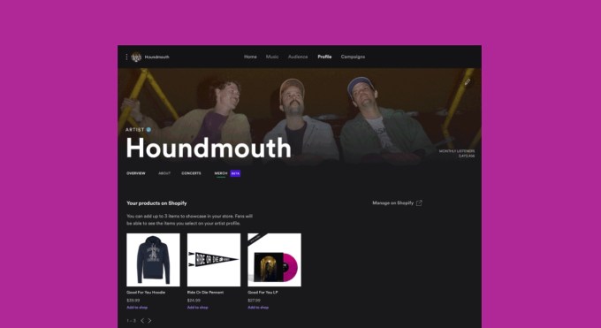 “Artists today are entrepreneurial. They’re building multifaceted brands and businesses, and now we’re making it easier for them to meet fans where they are,” said Amir Kabbara, Shopify’s director of Product, in a statement. “By bringing entrepreneurship to Spotify, we’re empowering artists to think beyond the traditional merch table with new ways to monetize, and to experiment with their brands through commerce.”