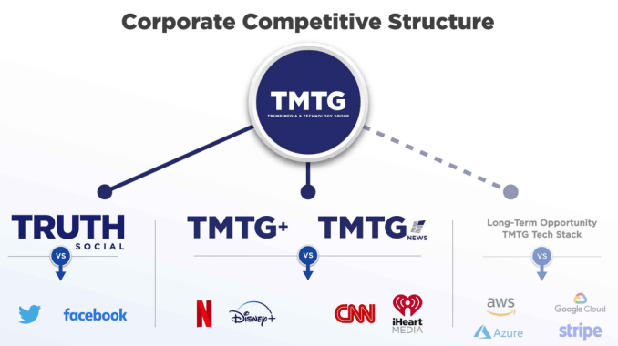 The business targets of TMTG are pretty clear: Major social media platforms like Twitter and Facebook, and major technology companies like Amazon, Microsoft, Google and Stripe. The group also has plans to take on major content streaming firms like Netflix and Disney, and major news orgs like CNN, along with audio-focused groups like iHeartRadio.