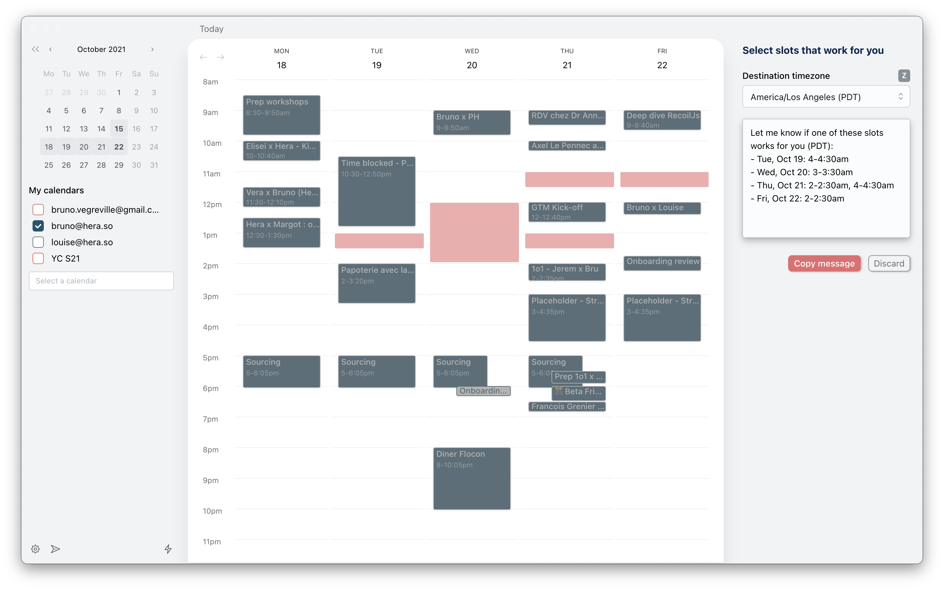 First, Hera can help you schedule a meeting and get ready for a meeting. In just a few clicks, you can select multiple slots. Hera then generates a friendly text that you can copy and paste in an email thread, in a WhatsApp conversation or wherever you’re talking about your next meeting.