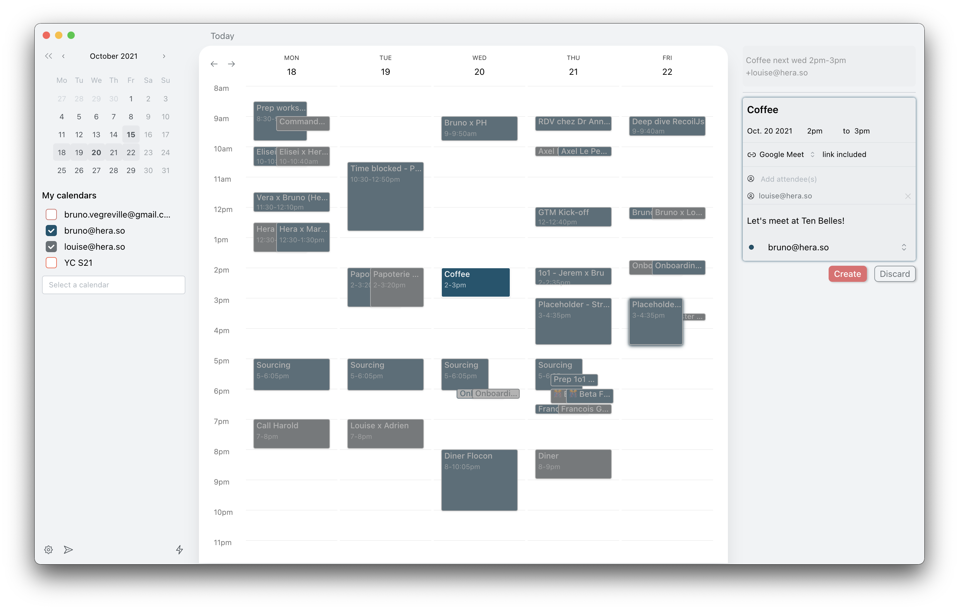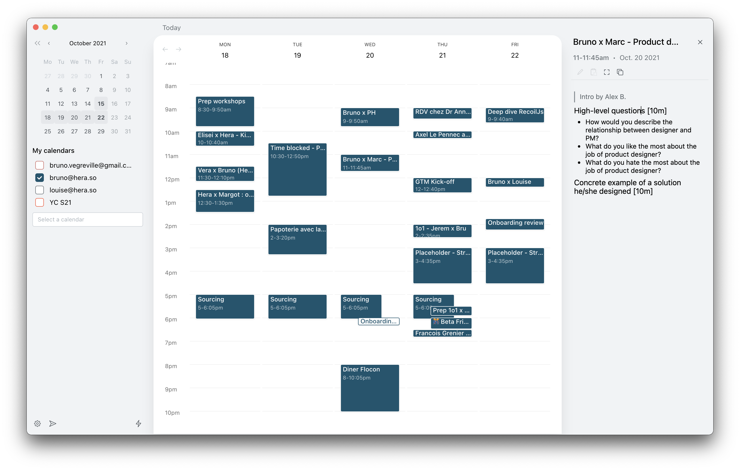Hera first started as a calendar app focused on note-taking during meetings. Since attending Y Combinator, the product has evolved quite a lot. It is now focused on managing the entire lifecycle of an event for busy people who manage a lot of (virtual) meetings.