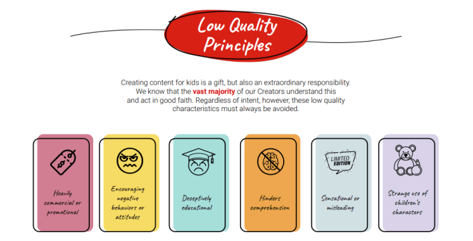 This includes content that encourages negative behavior and attitudes (like bullying, dishonestly, disrespect to others, dangerous pranks, unhealthy eating habits and more); content that’s deceptively educational; content that hinders comprehension; content that’s sensational or misleading; and content that includes strange use of children’s characters. (The latter had been a particular problem in recent years, such as videos featuring characters like Peppa Pig in situations that were not kid-friendly).