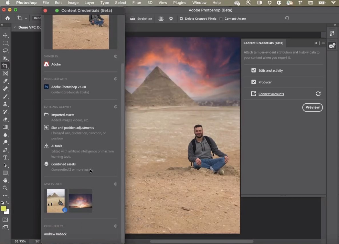 Specifically, Adobe is launching what it calls “content credentials.” This includes an opt-in feature in Photoshop that cryptographically signs the metadata and edit history of content credentials-enabled images, as well as the automatic download of content credentials from Adobe Stock, the company’s stock imagery service. As you edit photos in Photoshop, the application will automatically update the edit history — including the use of AI tools — and a list of assets you used to create your images in the background.