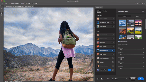This year, it is introdu0cing a feature called “landscape mixer.” By moving a few sliders, you can make your photo look like it was taken in the fall or winter, for example, either using a set of presets or by creating your own custom ones. Say there’s a bit of a drab foreground but you want a green image; find yourself an image with a verdant green landscape to transfer that style and you’re good to go.