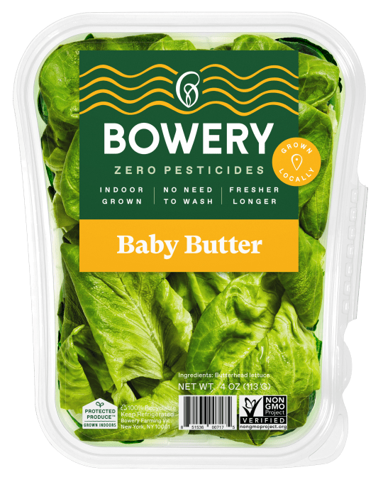 Bowery’s design doesn’t scream “vertical farming.” You get the company’s name in big, bold letters, followed by “zero pesticides” and “grown locally.” The words “indoor grown” offer some insight, but in a world where many have at least set foot inside a greenhouse, the phrase could mean any number of things. The remainder of the notes, “no need to wash,” “fresher longer” and “non-GMO” are standard fare for the produce section.