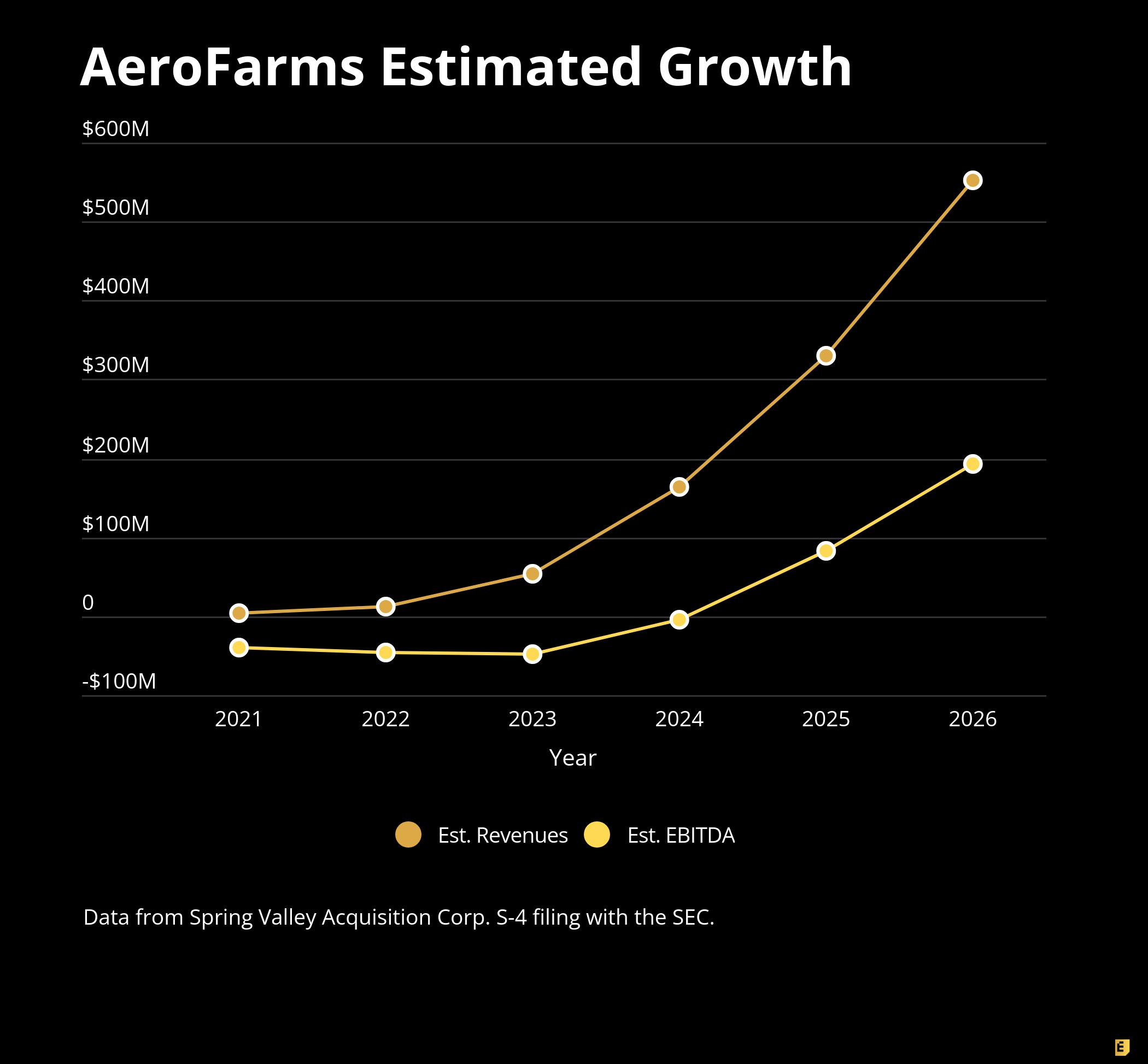More than anything, a SPAC is an opportunity to inspect the financials of a private company. In the case of AeroFarms, specifically, it’s an opportunity to see how close the 16-year-old company is to profitability. The SEC filing has the company’s revenues in 2020 equaling $2.5 million, with losses of about $25 million. The company projects EBITDA revenue in the red through 2024, finally reaching profitability at $82 million in 2025. It’s a long runway for a company that has been in the game as long as AeroFarms has.