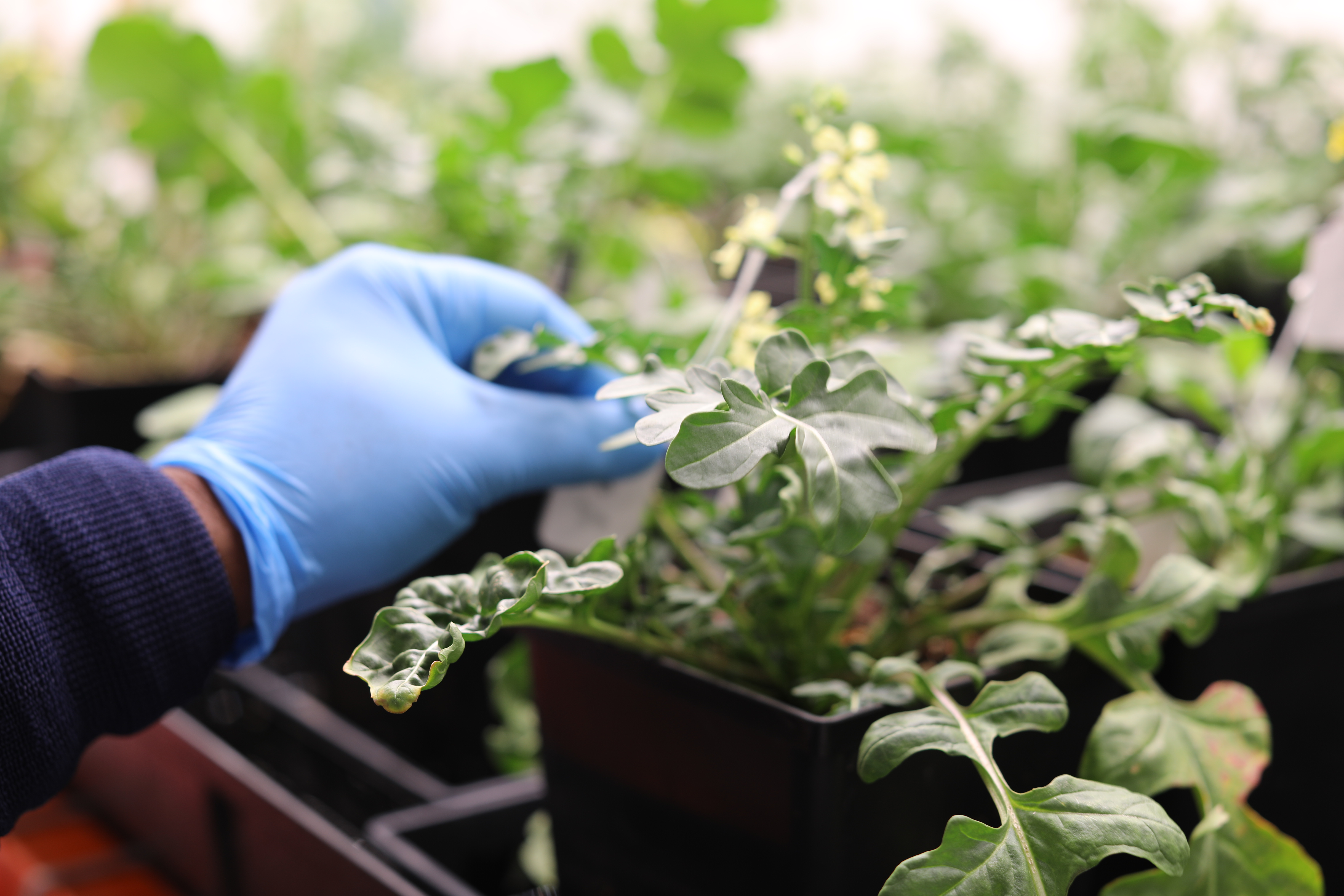 Sztul walks up to a tray overflowing with long, green leaves covered in small flowers. He grabs a pair of surgical gloves and scissors, snipping off a leaf. He drops it in my hand and motions for me to taste.