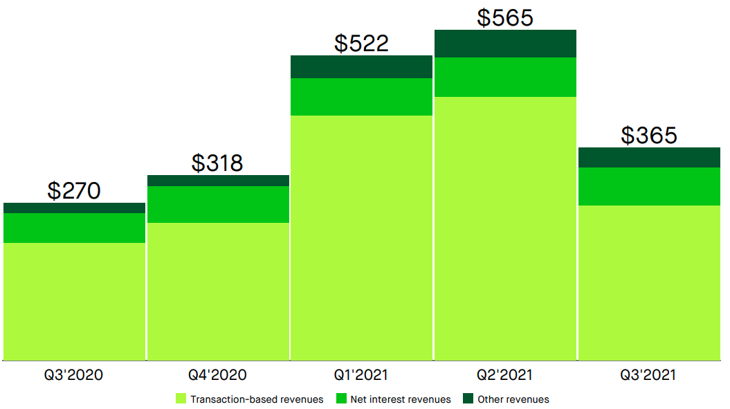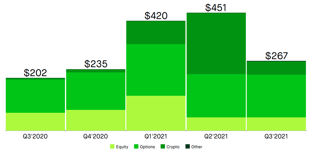 Before we get into the why, let’s talk raw figures. In the three months concluding September 30, 2021, Robinhood generated $365 million in revenue, up 35% from its year-ago quarter. The company generated options-related transaction revenues of $164 million (+29% YoY), cryptocurrencies-related revenues of $51 million (+860% YoY) and equities transaction top line worth $50 million (-27% YoY).