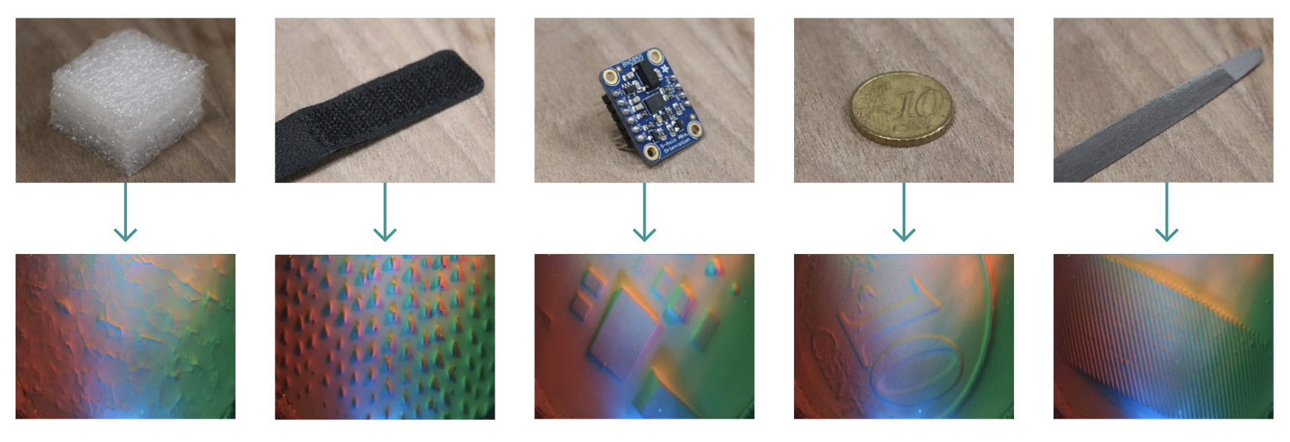 DIGIT was released in 2020 as an open source design; it uses a tiny camera pointed at the pads to produce a detailed image of the item being touched. You can see the fingertips themselves in the image at top; it’s quite sensitive, as you can see from the detailed maps it’s able to create when touching various items: