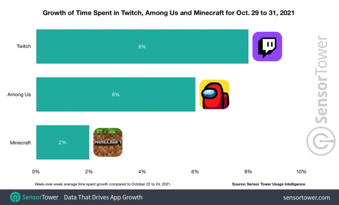 The firm also took a look at the game-streaming app Twitch, and found time spent in the app had grown by 8% week-over-week and saw an 11% increase in average session count. But in this case, not all the growth may be attributed directly to the Roblox downtime. Sensor Tower also notes that Twitch was hosting the League of Legends semi-finals over the Halloween weekend, and it was featuring many special holiday streams from popular gamers.