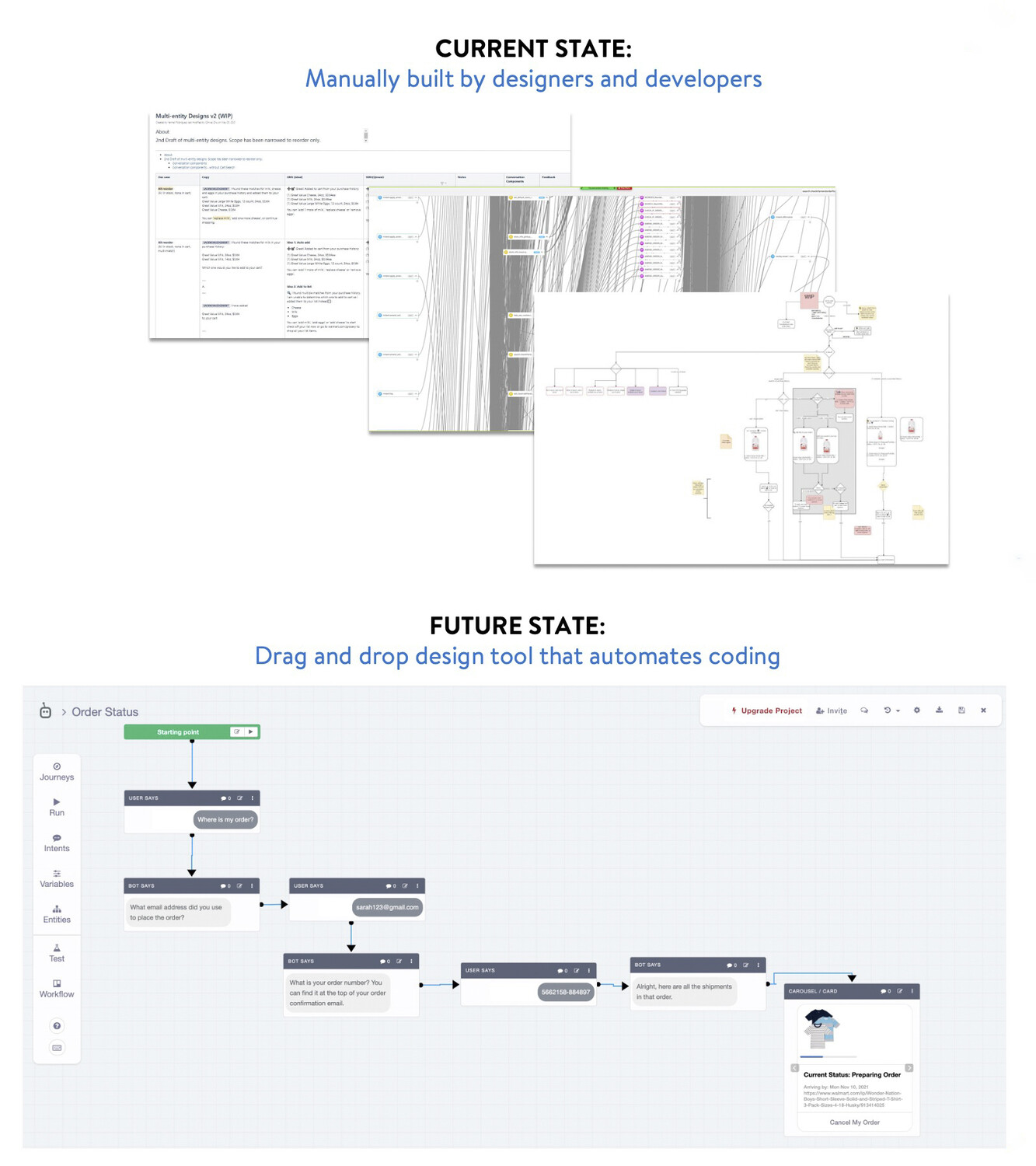 Meanwhile, non-developers were using tools like Visio or Lucidchart to create their conversation flows. Botmock promised a better toolset that would allow teams to avoid blind spots in their design and build better overall conversational experiences.