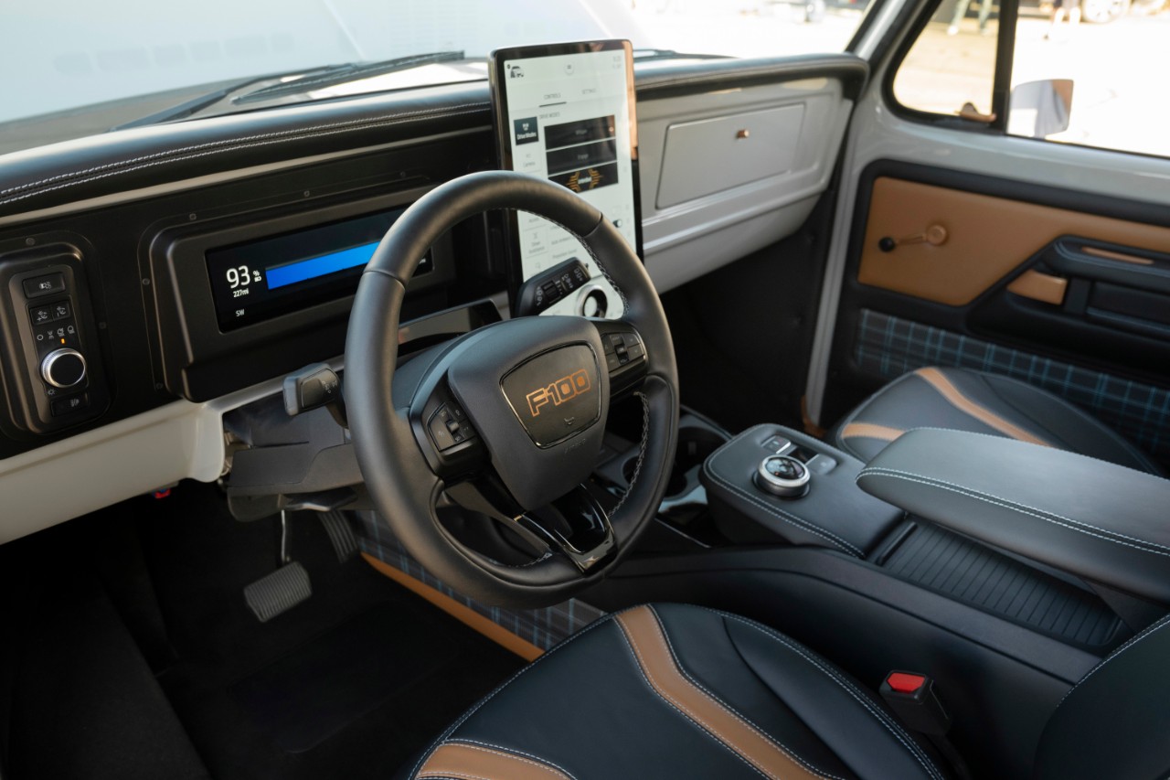 The truck has more customizations beyond the EV motors, including the vertical center-stack touchscreen from the Mach-E. You’ll also see custom aluminum Forgeline wheels, a billet aluminum dash from JJR Fabrication and avocado-tanned leather from MDM Upholstery. This may look like a classic truck, but it’s not appointed like one.