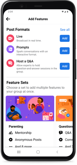 With the new tools, admins will be able to change the group’s colors, post backgrounds and fonts that appear in the group, and the emoji that members use to react to its content. They’ll also be able to use feature sets to select from preset collections of posts, formats, badges, admin tools and more that they can then enable for their group with a click to customize the group further. Admins could add multiple feature sets designed around what their group is about (e.g. “parenting”) or what sort of functionality it may offer (e.g. “questions and advice,” “real-time connections,” “learning,” etc.).