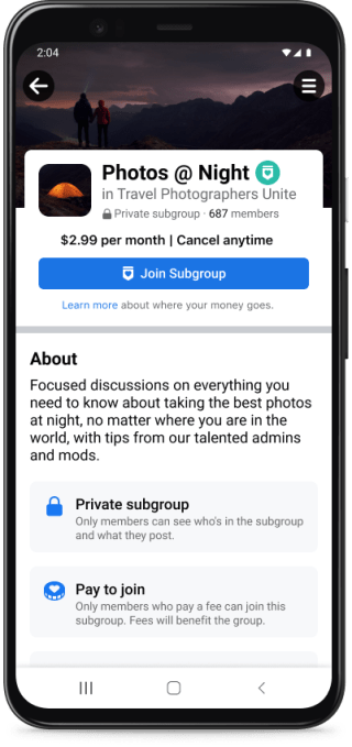 Another interesting aspect to this test is that Facebook will permit groups to create paid subgroups that group members can subscribe to for a fee in order to access exclusive content or experiences. Facebook suggests the feature could be used for things like coaching, networking or other “deeper conversations.”