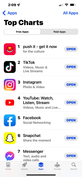 The test for Push it now is whether or not it can sustain such a high ranking in the App Store — organic or otherwise — something that’s proven difficult for other newcomer social apps. It may also have to contend with the coming regulatory crackdown on social experiences designed for minors and younger teens. If Push it gains traction, it may have to rethink its privacy policy and forthcoming revenue models.