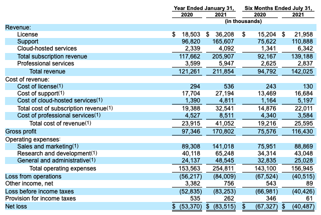 Under the revenue tab, we can see how license, support and cloud-hosted services constitute the subscription line item, which is supplemented by professional services to create a top-line aggregate. From those totals, we can see that HashiCorp grew from $121.3 million in the year ended January 31, 2020 to $211.9 million in the following 12 months, or revenue expansion of just under 75%.