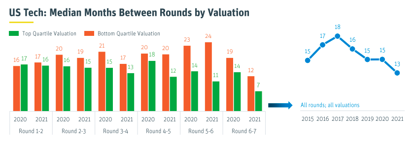 First, let’s examine how the time between funding rounds has fallen. SVB data shows a useful 2020 versus 2021 differential, with an aggregate chart tracking the same data over a longer time period on the right: