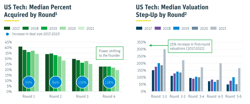 And what are venture investors getting for bigger rounds at higher multiples? Less ownership!