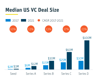 But putting more capital into startups more quickly isn’t cheap. Deals are getting bigger over time, and they are growing the fastest at the later stages of the market. As we can see in the following SVB graphic, the compounded growth rate of Series D rounds is higher than the growth rates posted by earlier rounds. Also note that there is an upward swing to round CAGR as we go up the startup maturity lifecycle: