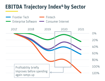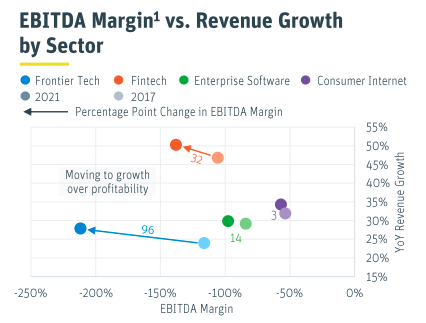 So, the rising losses we saw before are tied to accelerating growth, just not as much for enterprise software and consumer internet companies as we would have anticipated. And the faster growing categories — frontier tech and fintech — are the two least profitable groups, implying that their growth is dearly bought.