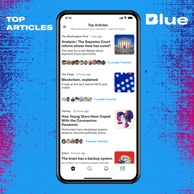 Today, Twitter says it will make this same feature available to Twitter Blue subscribers as Top Articles. The feature will allow users to see the most shared articles in their network over the past 24 hours.