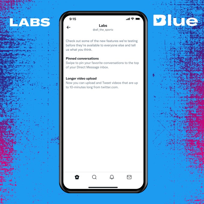Subscribers also gain access to Twitter Labs, which is where Twitter will roll out its early-stage experiments first. At launch, Twitter Labs offers longer, 10-minute video uploads from the web (instead of two minutes for non-subscribers), and the ability to pin favorite Direct Message (DM) conversations to the top of the inbox, both of which were previously announced.