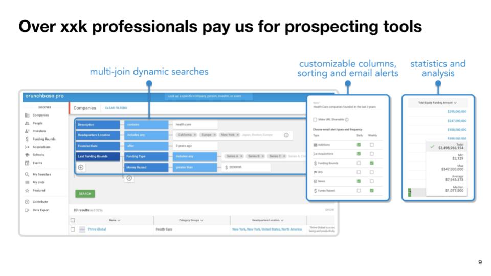 While this slide does an excellent job of showcasing product features, it’s still unclear how Crunchbase’s customers are using the platform. None of the slides on the deck (at least in the public version) provided a more profound example of platform usage inside one of the organizations that use them.