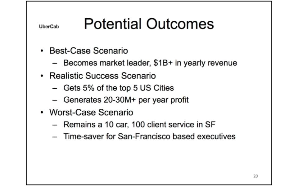 “Possible outcomes” is not a slide that we often see in pitch decks. Still, it can serve the beneficial purpose of lining up founder and investor expectations: Uber was ambitious enough to expect more than $1 billion in revenue, but its realistic expectation was very down to Earth.