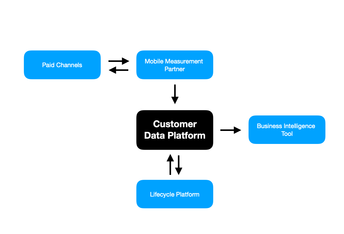 In this simplified representation of a lean growth stack, there is a customer data platform, business intelligence tool and mobile measurement partner. The paid channels and lifecycle platform are acquisition mediums, which pass data back to the centralized customer data platform. As the customer data platform receives data, it federates data to the business intelligence tool for visualization.