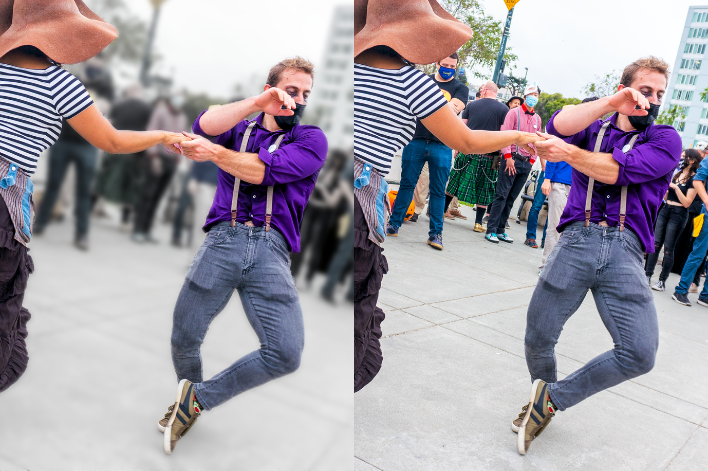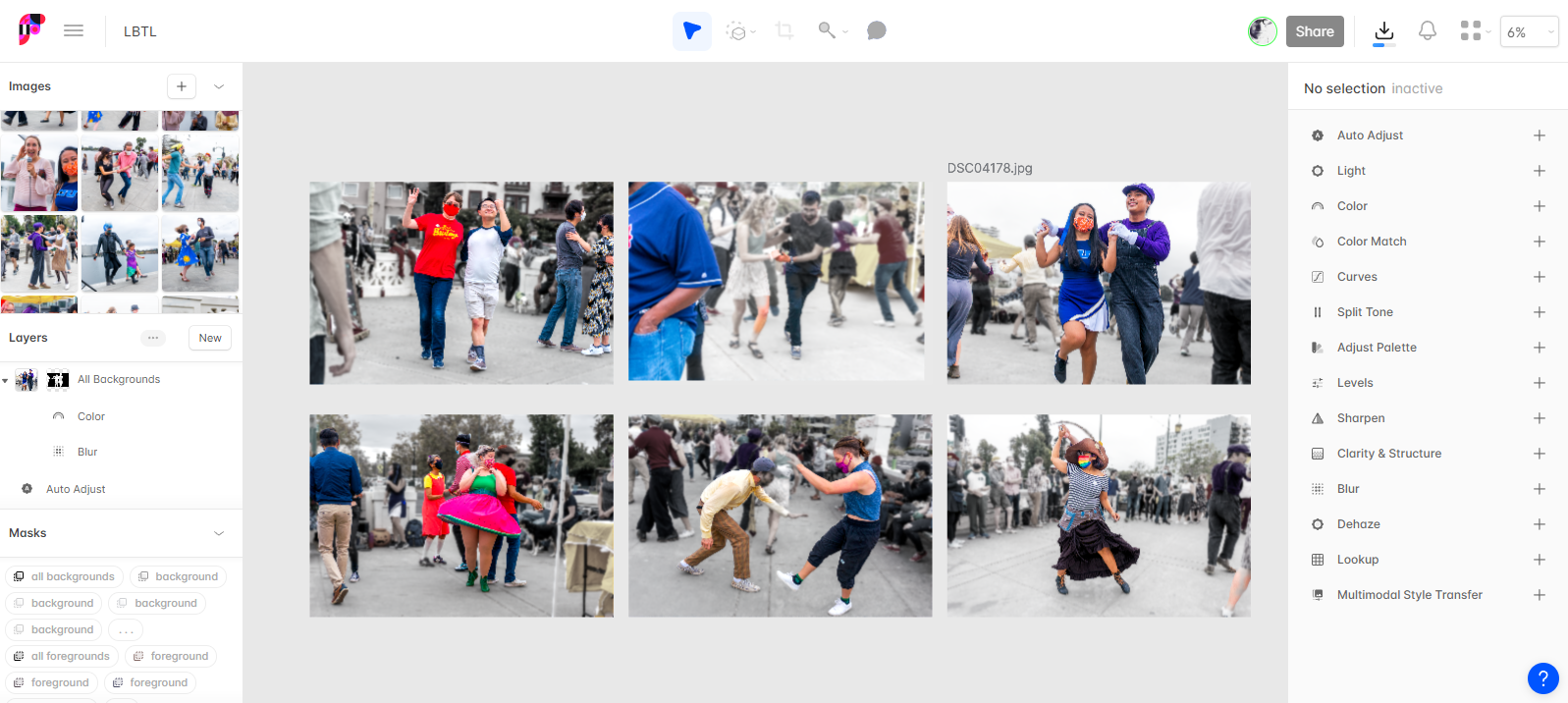 It all became a lot clearer when I got a chance to play with the tool for myself. I uploaded a gallery of dance photos I shot at a recent Lindy by the Lake dance event in Oakland, and let Facet do its thing. The web-based editor has a profoundly steep learning curve — a learning wall, if you will — but I was very quickly able to do some editing that would have been hard, if not impossible, in Photoshop.