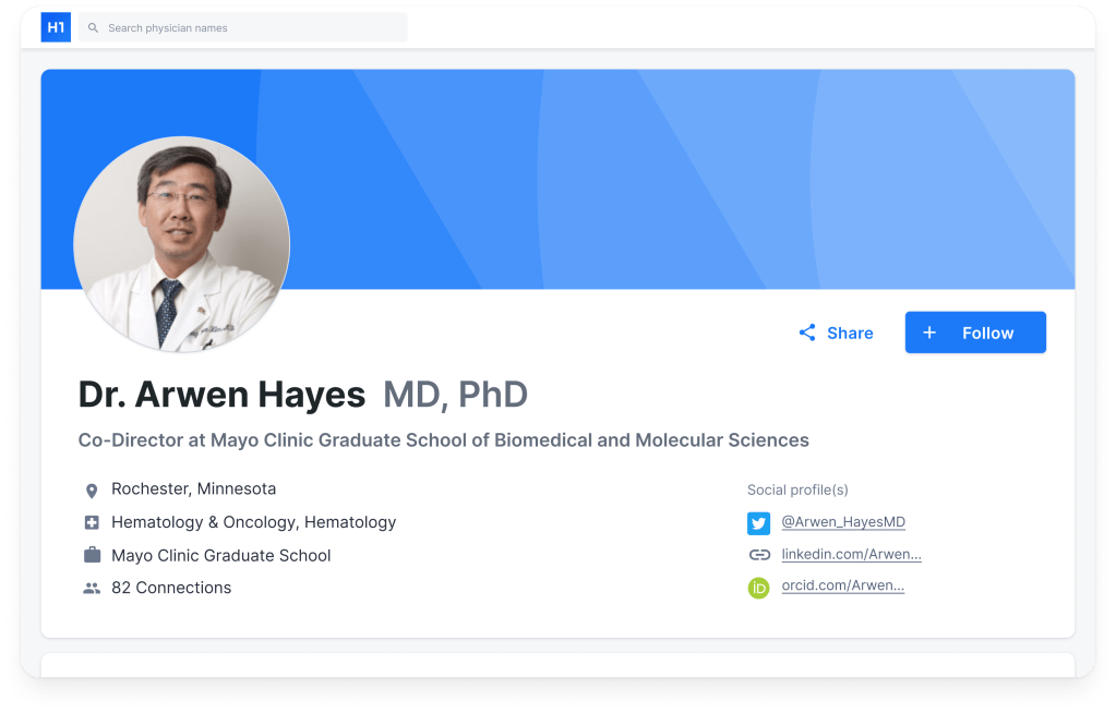 The concept behind H1 is simple: It’s an increasingly rich database of medical expertise. The service hosts profiles for millions of physicians and can surface key figures in a given field by reviewing those profiles alongside scholarly publications or medical claims data. It can also provide insight into the patient groups each physician is likely to treat and an expert’s openness to participating in clinical trials.