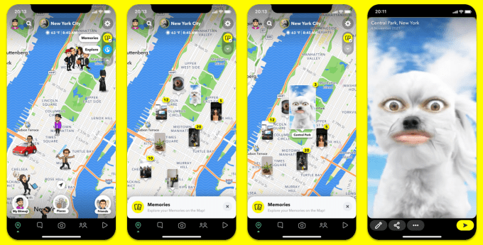 The Snap Map has been used to show people where their friends are currently located (if they opt-in to location sharing), interesting places to visit and which areas are most popular among Snapchatters. Memories will show you old Snapchats that you sent from particular places — so, if you browse your map and zoom in on Central Park, you might find a picture you took last year of a cute dog in the park. Memories are private and only available to the individual user — you can’t see friends’ memories.