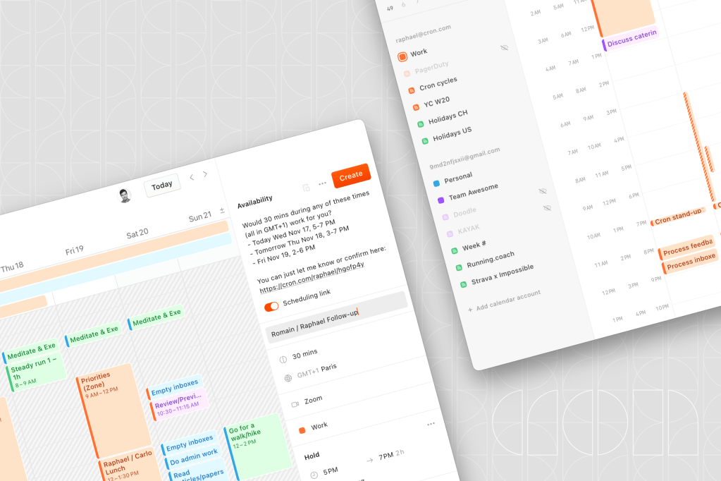 Schaad has a big vision for his startup. “We want to build the time layer of the internet,” he said. Right now, Cron is available to some users in early access and the app only supports Google accounts. But it should be available soon to everyone with support for Microsoft and iCloud accounts.