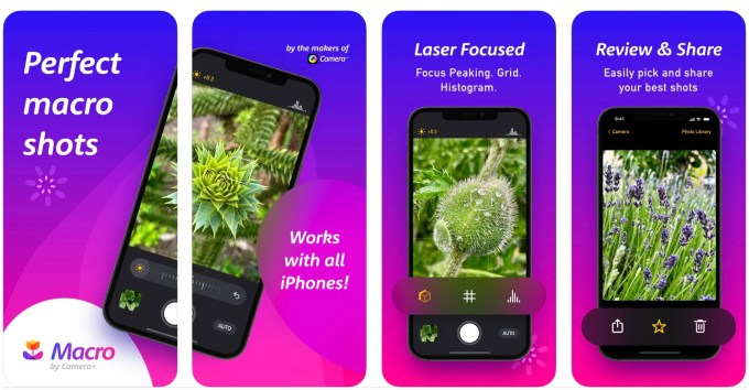 A new app from the makers of Camera+, Macro+, is designed to capitalize consumer interest in up-close photos following the new iPhone’s support for Macro photography. However, this app is designed to work on any iPhone capable of running iOS 15, the developer says — which means it’s not just for those with the latest hardware. Instead, the app helps by outlining the parts of the photo that are in focus, providing a grid for positioning the subject, and it offers a histogram to visualize the brightness of your shot. After snapping the photo, Macro+ will intelligently edit the photos to make subjects look crisp, even if you’re not a skilled photographer. The Camera+ app includes a similar Macro tool, but the new app is meant for those who want more of a single-purpose tool for their up-close photos or who feel overwhelmed by more professional camera apps and their many options.