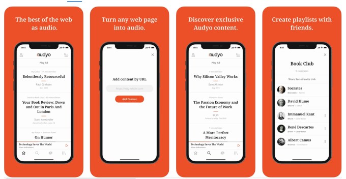 iOS audio app Audyo exited private beta this week to offer users a way to convert web pages into high-quality audio. The idea is to give users an easy tool for saving content from around the web, like news articles, and combine that with other audio content you may already be listening to — like Audible audiobooks and podcasts (neither of which is yet available, however). But the app isn’t only meant to serve as a utility — there’s a social component as well. Users will be able to share their listens with friends, discover community playlists and, highlight favorite content (including by double tapping the screen or triple-tapping your AirPods).