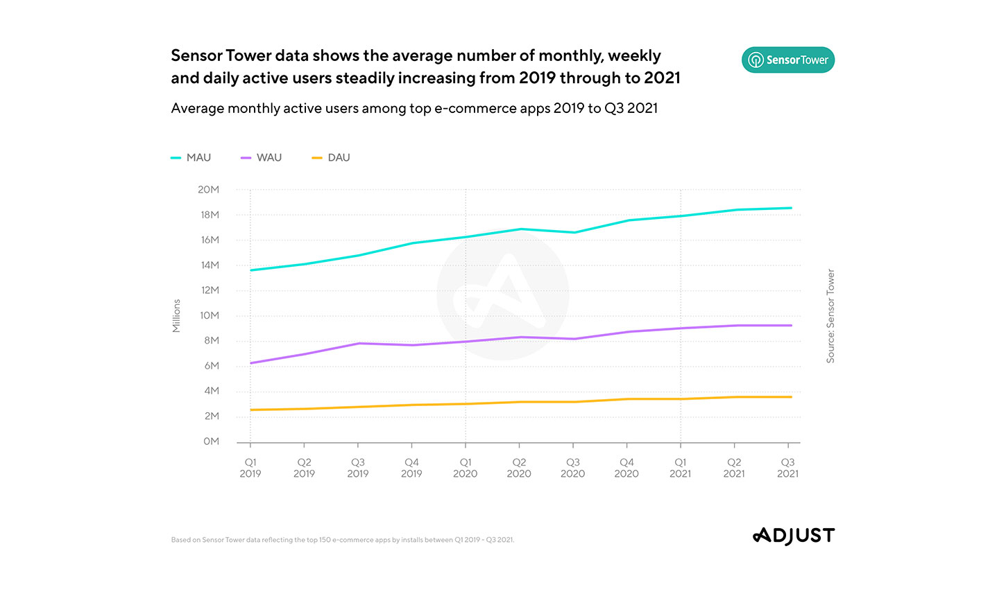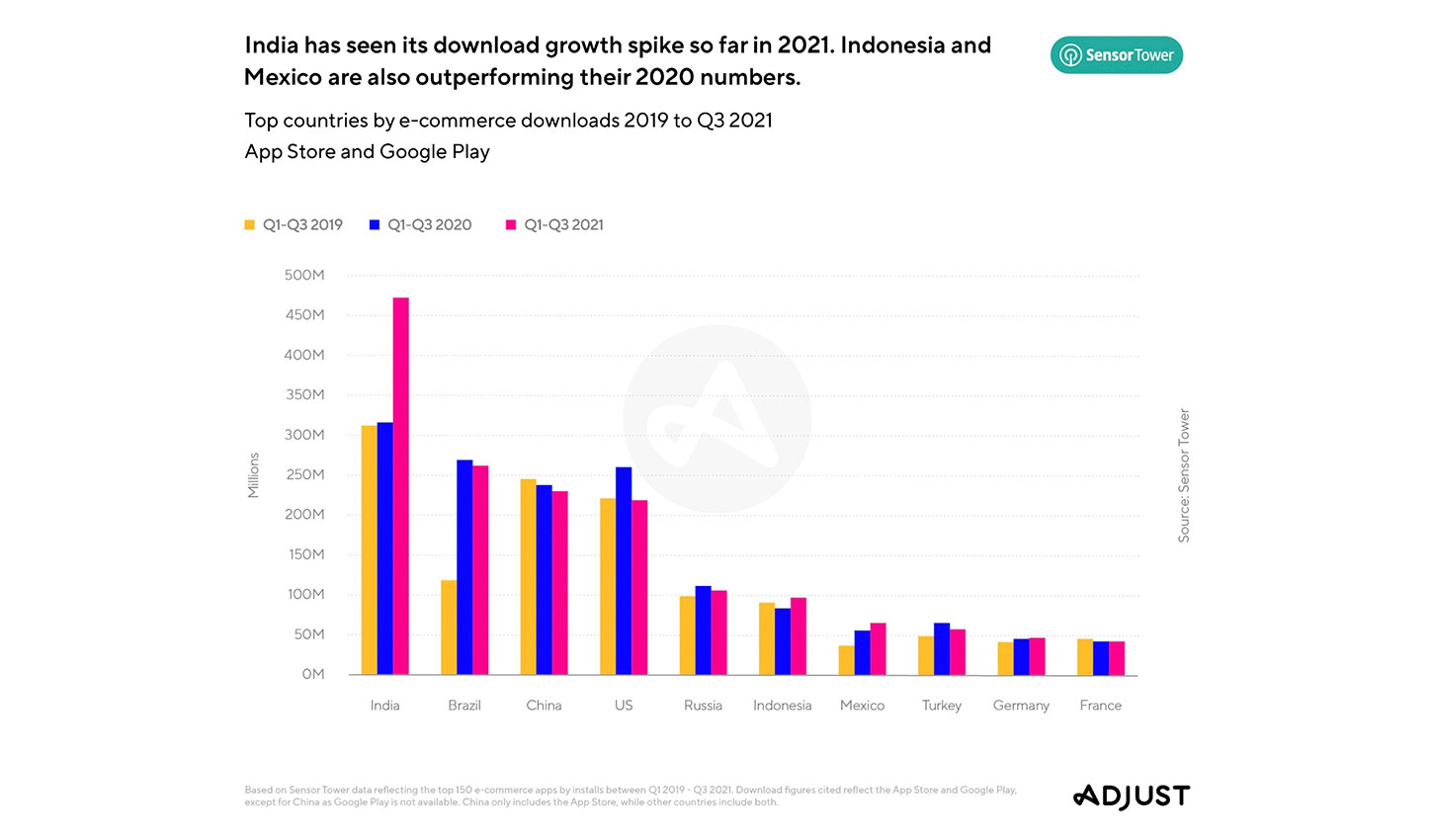 - Shopping app installs increased 10% year-over-year, according to a new report from Sensor Tower and Adjust. Average MAUs for the top 150 e-commerce apps globally were approximately 18 million in Q3 2021, up from 14 million in Q3 2019. India, Indonesia and Mexico led in downloads of e-commerce apps, while U.S. downloads slowed. In the first three quarters of 2021, India saw 470 million shopping app downloads, up 49% YoY. But U.S. downloads were 218 million, a decrease of 16% YoY.