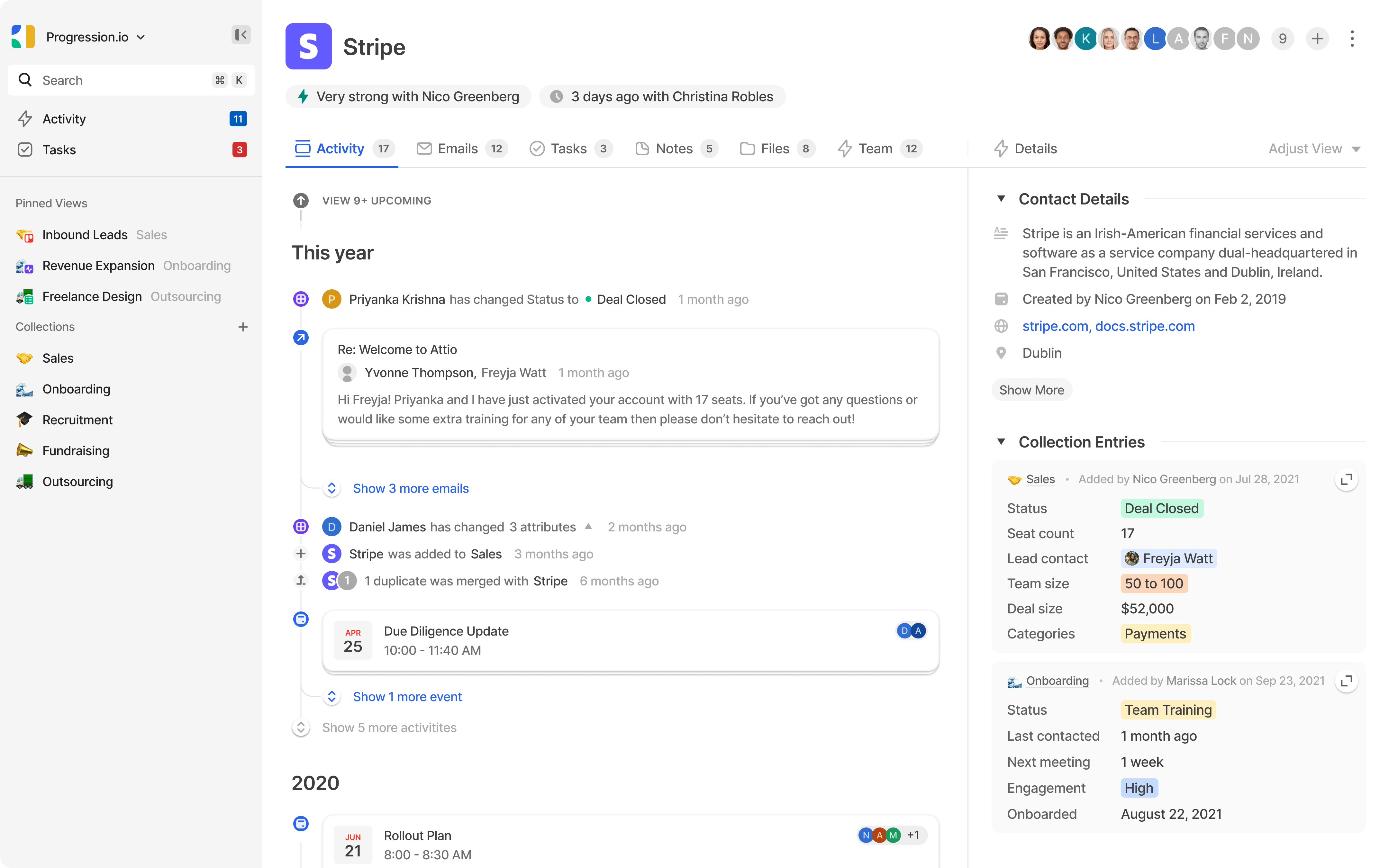 After that, Attio automatically enriches your data with more information from third-party sources, such as Twitter, LinkedIn and Facebook. You can view a timeline of your company’s recent interactions with a specific contact. You also can search for a company and view everybody you know at that company.
