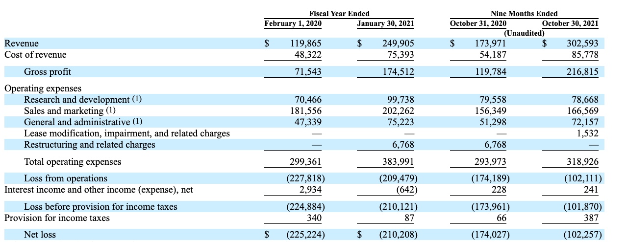 So, yes, Samsara can say that it is losing less money as time goes along and that it is still posting top-tier growth. Huzzah. I remain in awe of the company’s spending over time, however; dropping $156.3 million in sales and marketing costs against $119.8 million in three quarters of calendar 2020 is just bold.