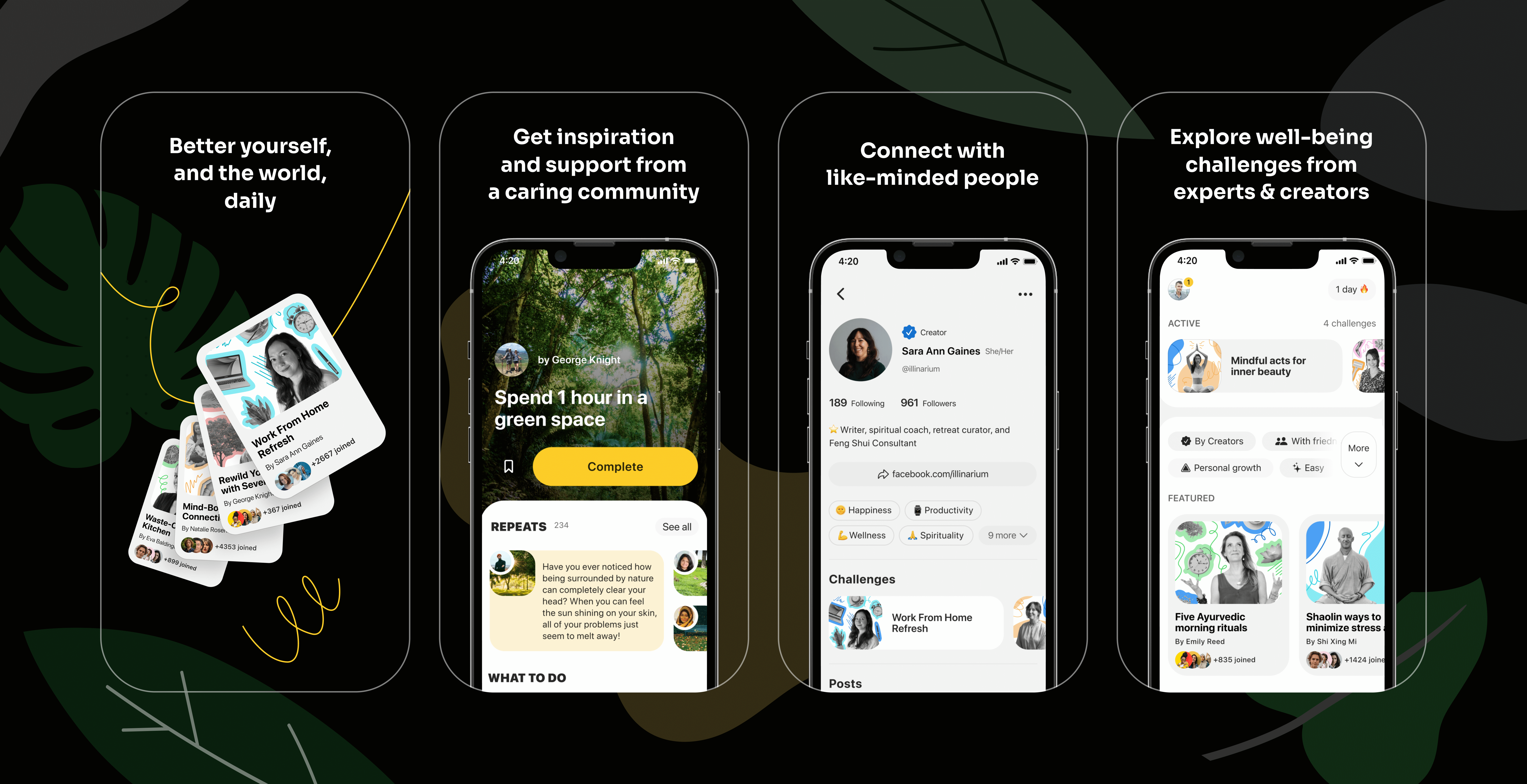 “A lot of us were feeling depressed and sad, at home without much access to friends and family,” he explains. “I felt like the world really needed something that’s a bit more than just meditation, journaling or mood tracking — all those apps and techniques are great, but they’re not designed to improve your life on a day-to-day basis, interacting in the real world.”