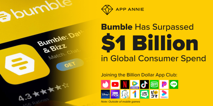 - Bumble surpassed the $1 billion mark in consumer spending, according to data from App Annie. The dating and networking app is one of only 15 other non-gaming apps, and the only dating app outside of Tinder, to have hit this milestone. In addition to Bumble and Tinder, other billion-dollar club members include YouTube, Netflix, Tencent Video, TikTok, iQIYI, Pandora Music, LINE, Disney+, HBO Max, BIGO LIVE, Google One, LINE Manga, piccoma and Youku. The WSJ also remarked this week that Bumble, with a fully diluted valuation of around $6.6 billion, is starting to look undervalued.